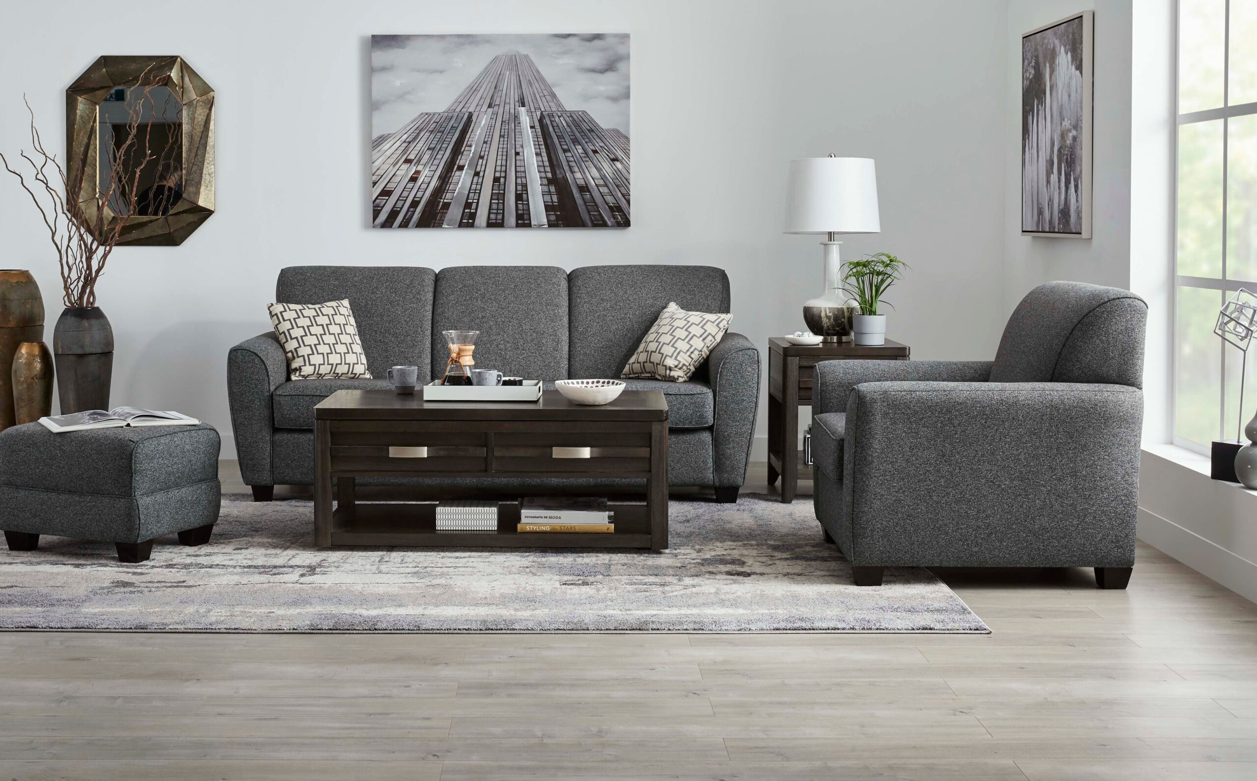 Smart Direction. Give your décor a strong new perspective with the Ashby sofa! Suited up in deep grey. this sofa boasts a menswear-inspired fabric that’s as handsome as it is durable. Tight-back cushioning. rounded design details and welted trim combine for a clean aesthetic. while smart construction keeps you well supported. Geometric-patterned toss pillows volumize the cool-guy style. Made in Canada.;;;;Ashby Sofa – gris;;;;Donnez à votre décor une nouvelle apparence avec notre sofa de la collection Ashby – gris! Présenté dans une teinte gris foncé. ce sofa met en valeur un tissu d’inspiration masculine qui est aussi magnifique que durable. Les coussins de dos collés. le design de détails arrondis et la bordure passepoil se mélangent pour une beauté sobre. tandis que la construction judicieuse vous permet de rester bien soutenu. Les coussins décoratifs à motifs géométriques donnent du volume au style renouvelé. Fabriqué au Canada.