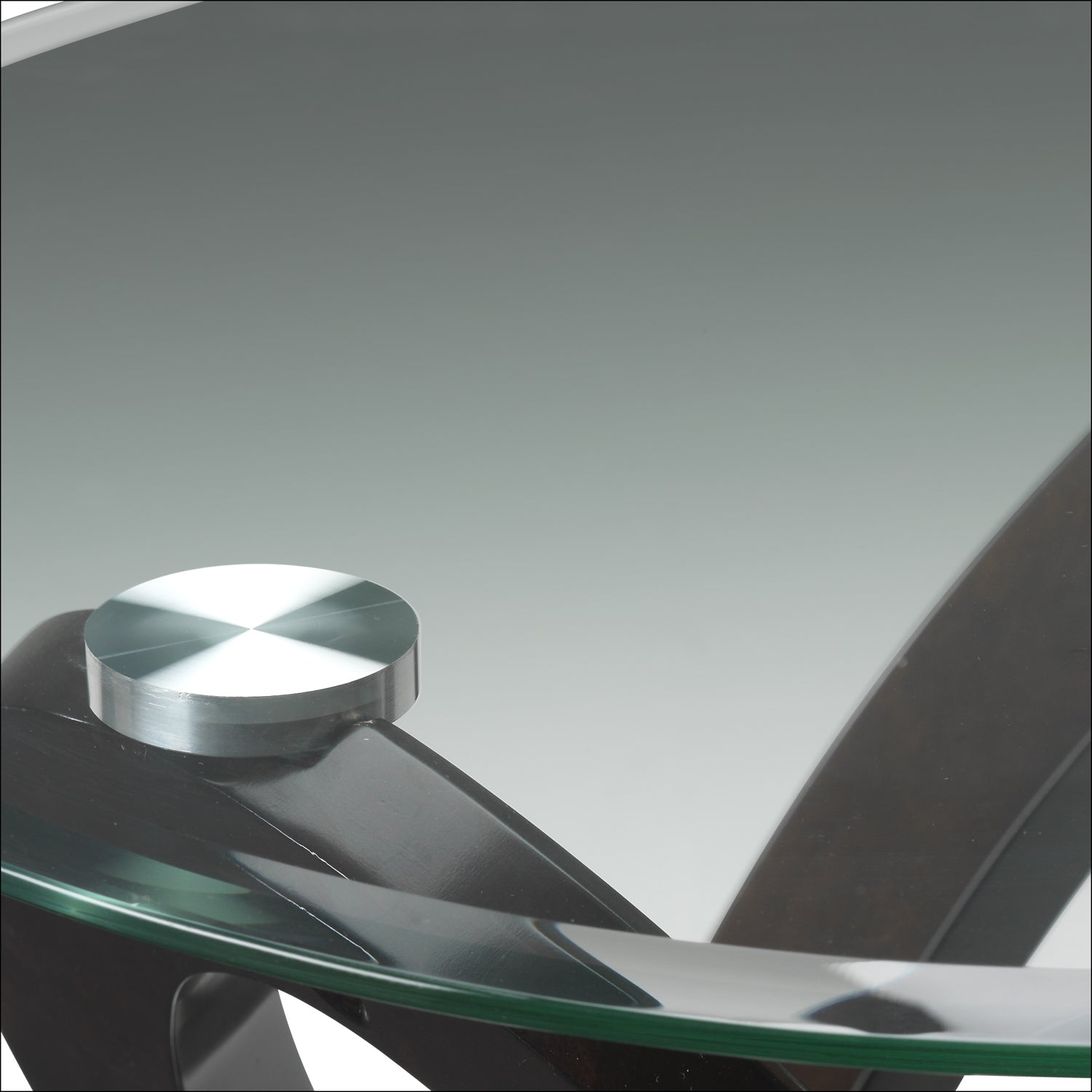 View from the Top. With its utterly modern architecture. the Atomic coffee table offers a new perspective on table design. The cool metropolitan look is achieved by using unexpected elements and open space. Intersecting wood rings are set atop a rounded wood base. and the oval. bevelled glass top is stylishly supported by nickel discs. Customer assembly is required.;;;;Atomic Table de centre 48 po – brun cerisier;;;;Vue d’en haut. Avec son architecture tout à fait moderne. notre table de centre de la collection Atomic offre une nouvelle perspective sur la conception de table. Le style métropolitain est obtenu en utilisant des éléments inattendus et un espace ouvert. Les anneaux en bois qui se chevauchent sont fixés sur une base ronde en bois. et le dessus ovale en verre biseauté est élégamment soutenu par des rondelles de nickel. Assemblage requis par le client.
