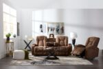 Experience ultimate relaxation with the Dallas Reclining Sofa. This seating solution offers manual recline. letting you sit back and unwind with ease. The drop-down center table. equipped with power outlets and lighting. adds a touch of convenience for charging devices or setting up snacks. creating the perfect setup for movie marathons or quiet evenings. With removable and washable arm cup holders. enjoy your favorite beverages without the worry of spills—keeping things clean is a breeze. For added practicality. the side arms flip up. revealing hidden storage space to keep essentials like remotes or books neatly tucked away but always within reach. Built-in USB ports make sure your devices stay powered up. so you’re never far from what matters. whether you’re catching up on work or immersed in your favorite shows. This thoughtfully designed furniture piece combines functionality with luxurious comfort. ensuring your living room is ready for any kind of downtime or family entertainment night.;;;;Dallas Sofa inclinable avec plateau rabattable – moka;;;;Faites l’expérience d’une détente ultime avec le sofa inclinable Dallas. Cette solution d’assise offre une inclinaison manuelle. vous permettant de vous asseoir et de vous détendre en toute simplicité. La table centrale rabattable. équipée de prises de courant et d’un éclairage. ajoute une touche de commodité pour charger des appareils ou préparer des en-cas. créant ainsi l’installation parfaite pour les marathons de cinéma ou les soirées tranquilles. Grâce aux porte-gobelets amovibles et lavables. profitez de vos boissons préférées sans vous soucier des éclaboussures – garder les choses propres est un jeu d’enfant. Pour plus de praticité. les appui-bras se relèvent. révélant un espace de rangement dissimulé pour garder les objets essentiels tels que les télécommandes ou les livres bien rangés mais toujours à portée de main. Les ports USB intégrés veillent à ce que vos appareils restent alimentés. de sorte que vous n’êtes jamais loin de ce qui compte. que vous soyez au travail ou plongé dans vos émissions préférées. Ce mobilier au design soigné allie fonctionnalité et confort luxueux. pour que votre salle de séjour soit prête à accueillir tout type de moment de détente ou de soirée de divertissement en famille.