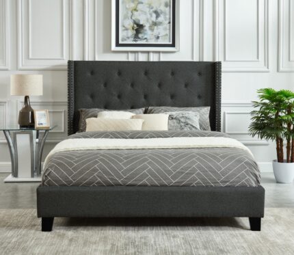 Simplified luxury has arrived and its name is Jaden. Upholstered in a soft to the touch velvet. the Jaden uses detailing like the diamond button tufted headboard with a brass nail head trim to give your room a lavish look. without taking up extra space. or overwhelming your décor. No matter how much room you’re working with. the Jaden will give you the luxe touch you’ve been looking for.