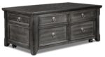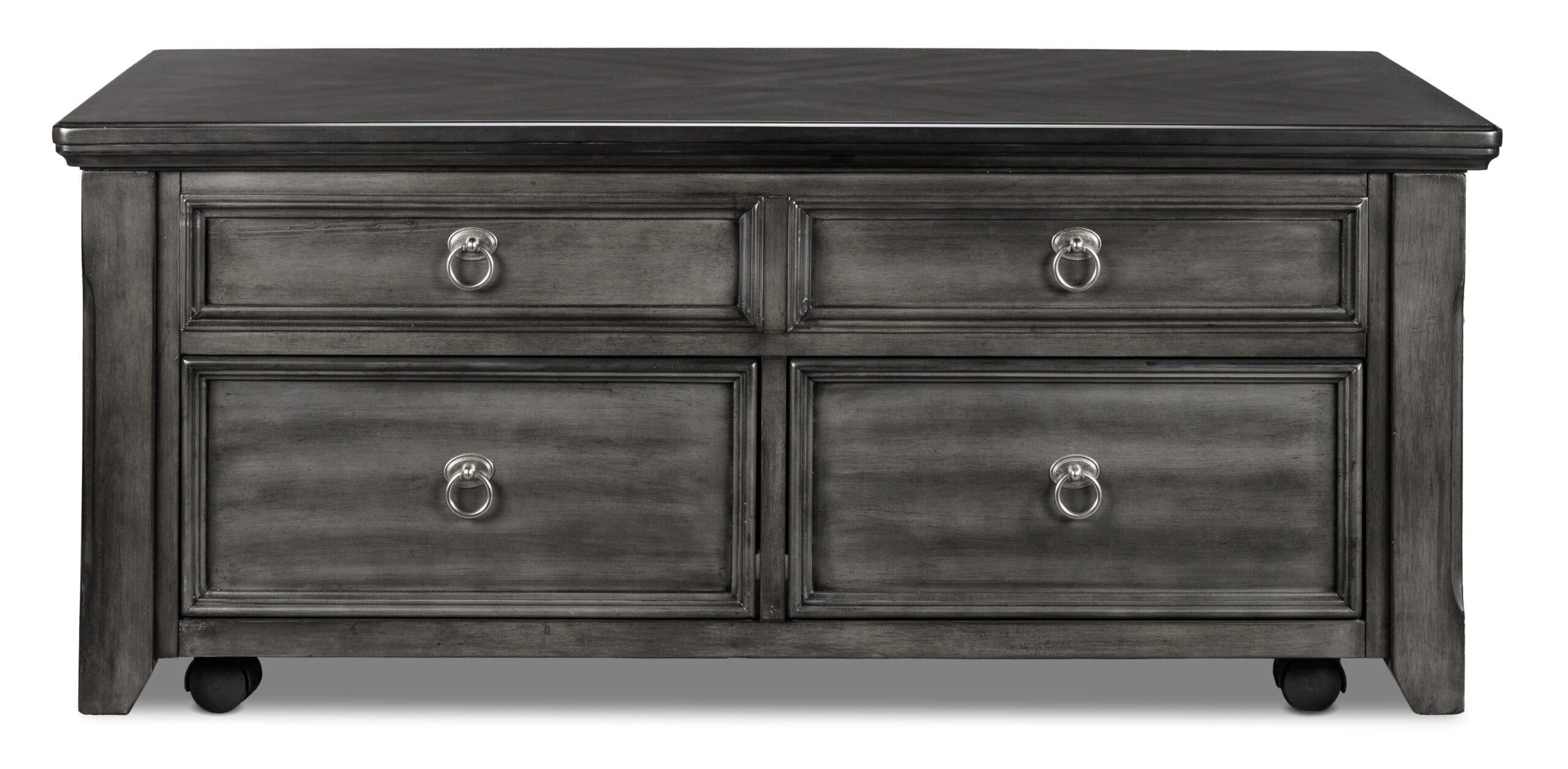 The Turner lift-top coffee table exudes natural elegance with its sleek grey finish. brushed nickel drawer pulls and picture frame moulding detail on the sides and front. Its lift-top table and castors offer hidden functionality. while the four functioning drawers provide ample storage space. Veneer over wood construction ensures durability and strength.
