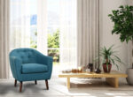 Mid-Sensational. The Zia accent chair boasts mid-century modern style for an on-trend retro look in your living area. Featuring a barrel design. this chair combines sloped arms. button-tufting and a well-padded loose seat cushion. The highly comfortable design creates a timeless look and cuts a sophisticated silhouette in any room. A rich blue colour finishes this furniture on a chic. modern note.